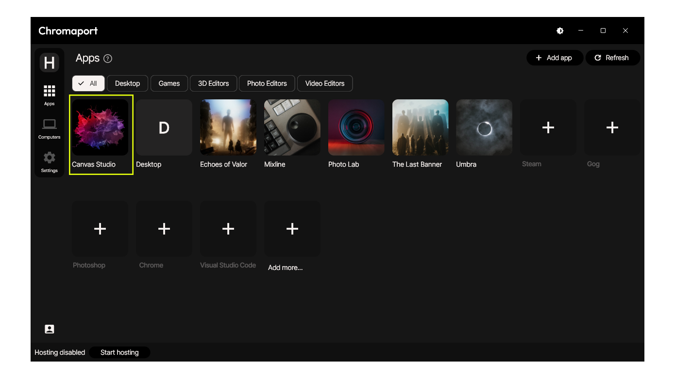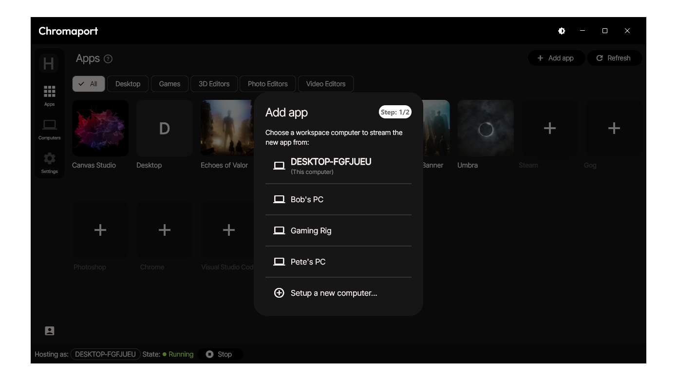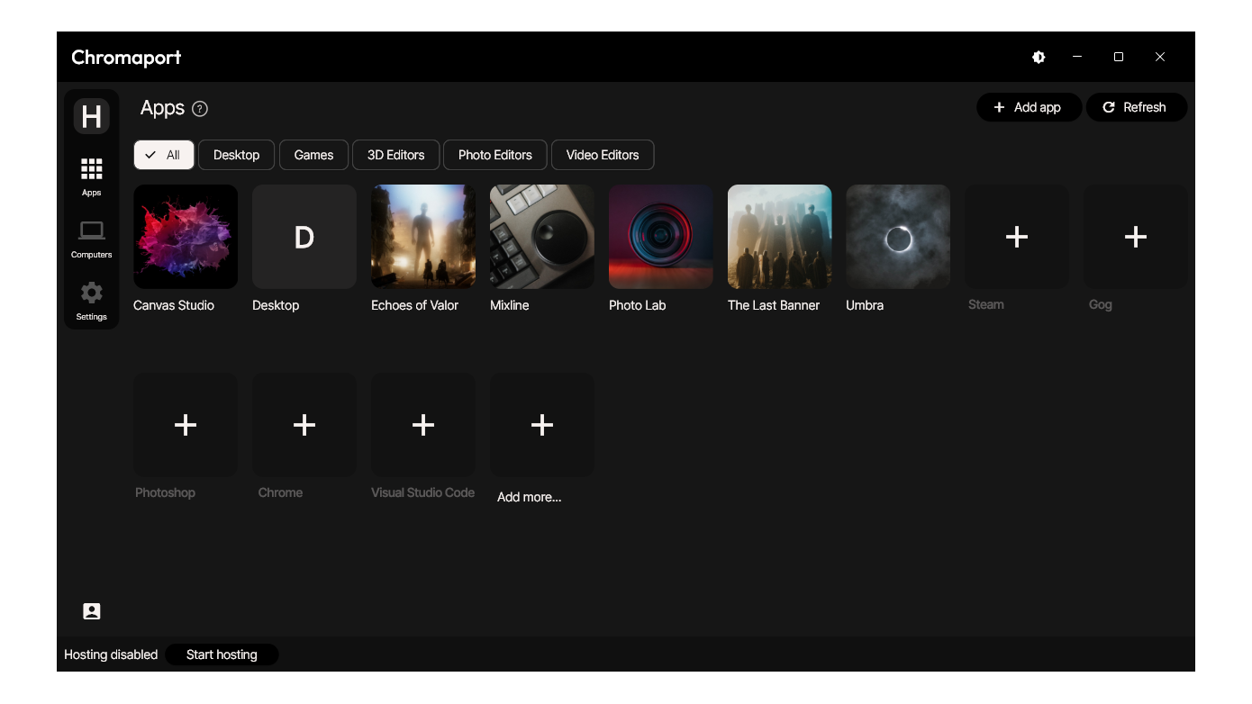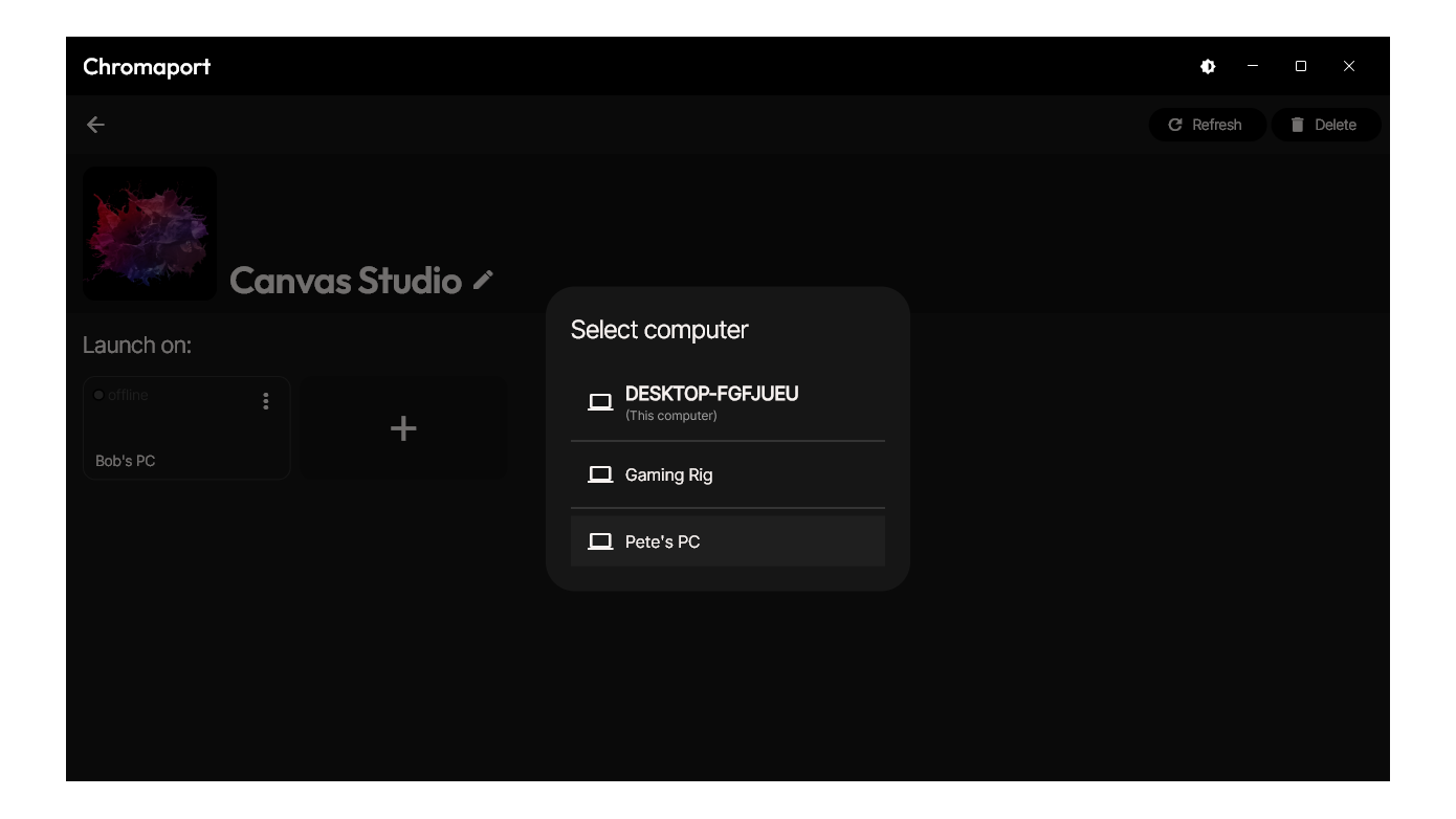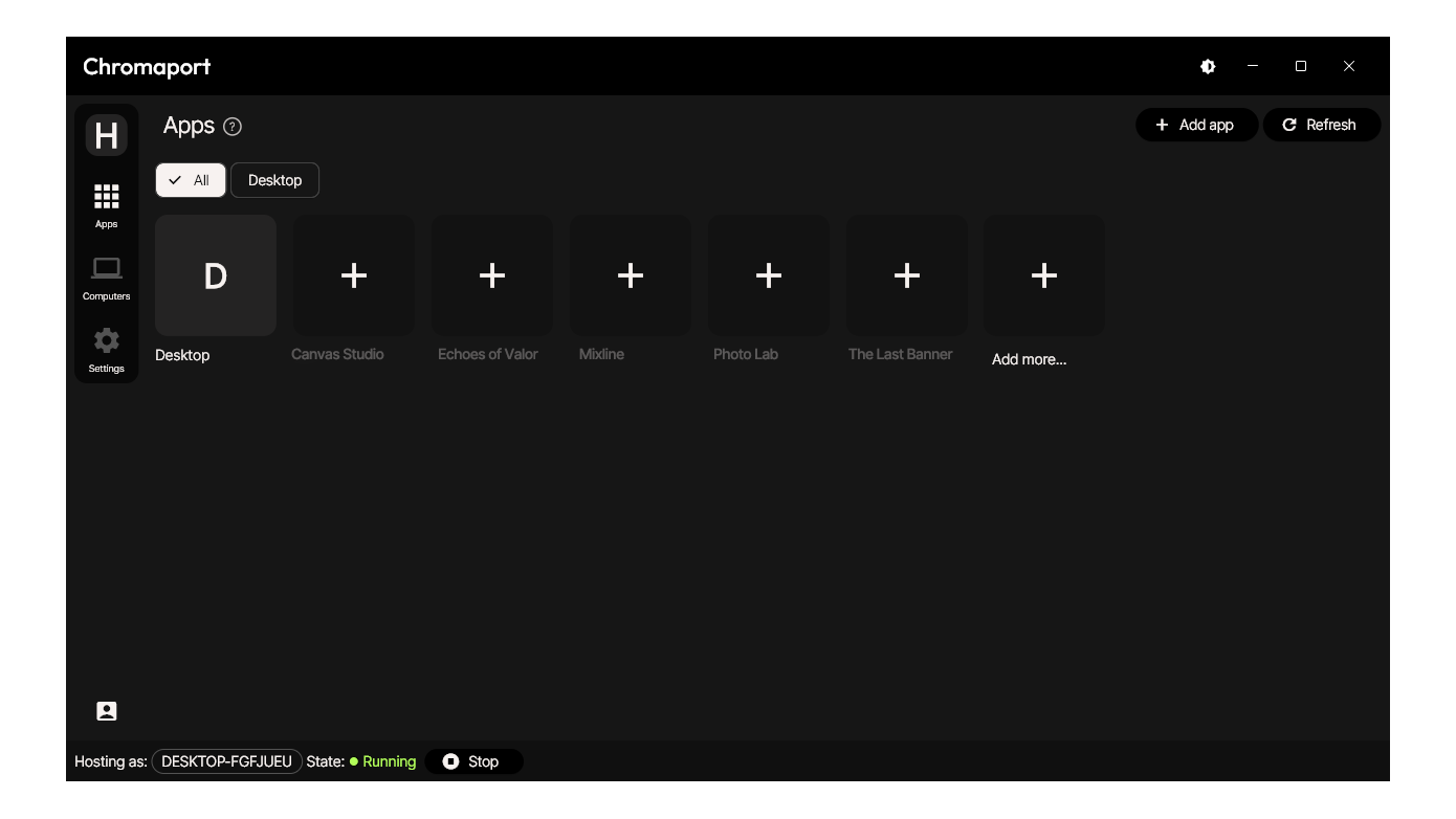After adding your computer and its applications, you can connect to them from any other device where the Chromaport app is installed.