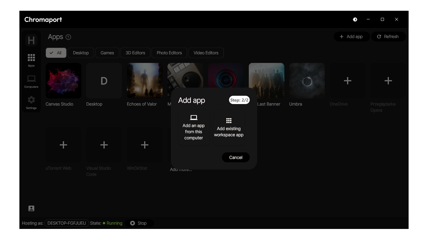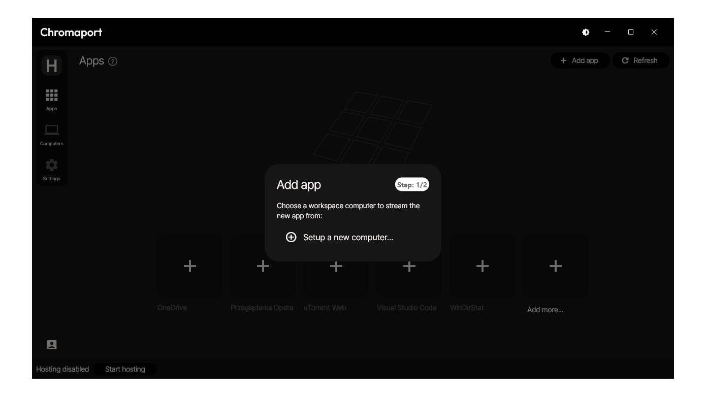 If you have more than one computer in your workspace, adding a new app (‘Add more’) in Apps View will show the message: ‘Choose a workspace computer to stream the new app from.’