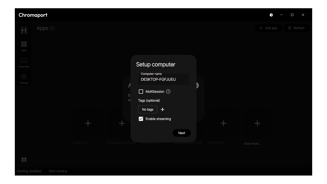To add more computers to your workspace, simply install the Chromaport app on each computer, sign in to your account and add the computer.