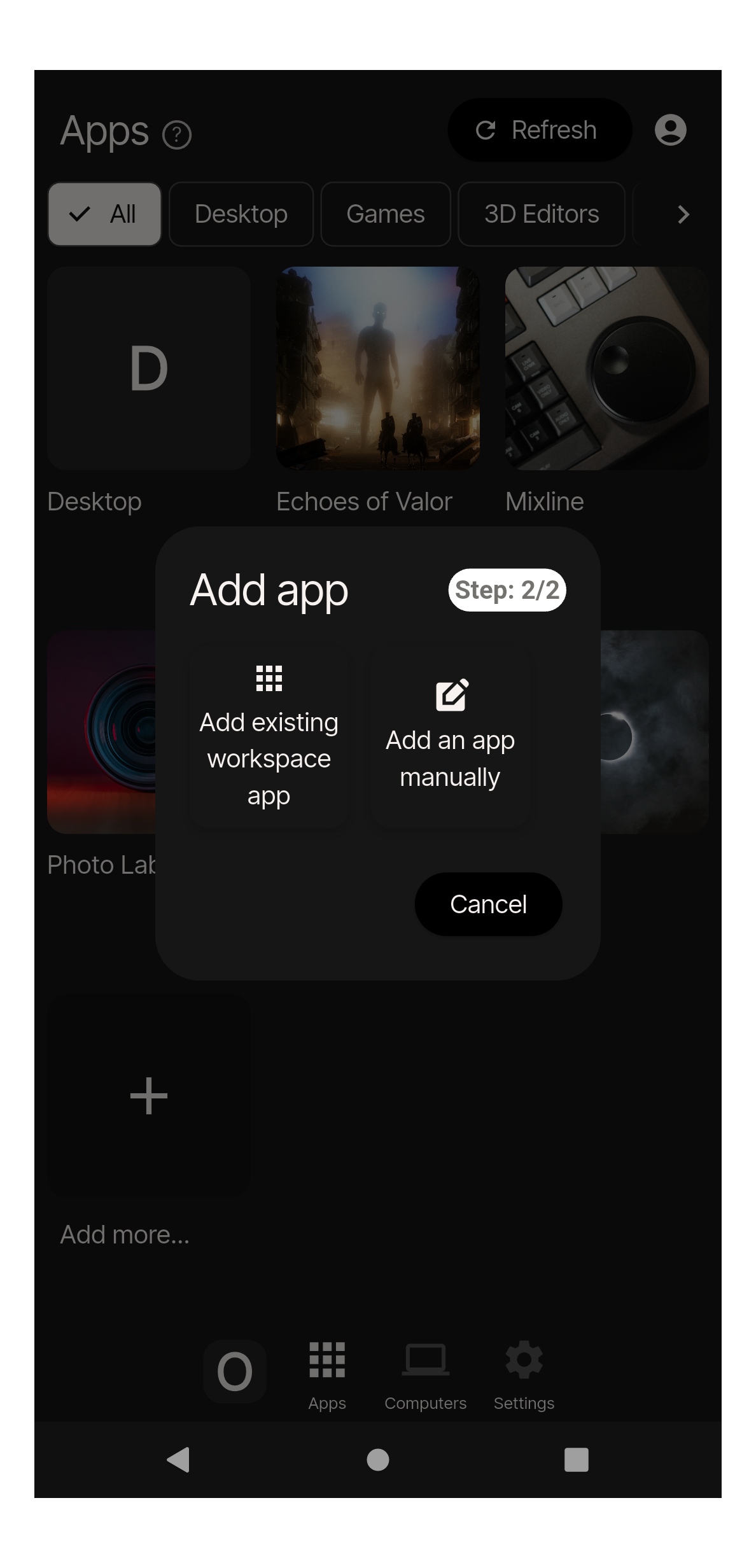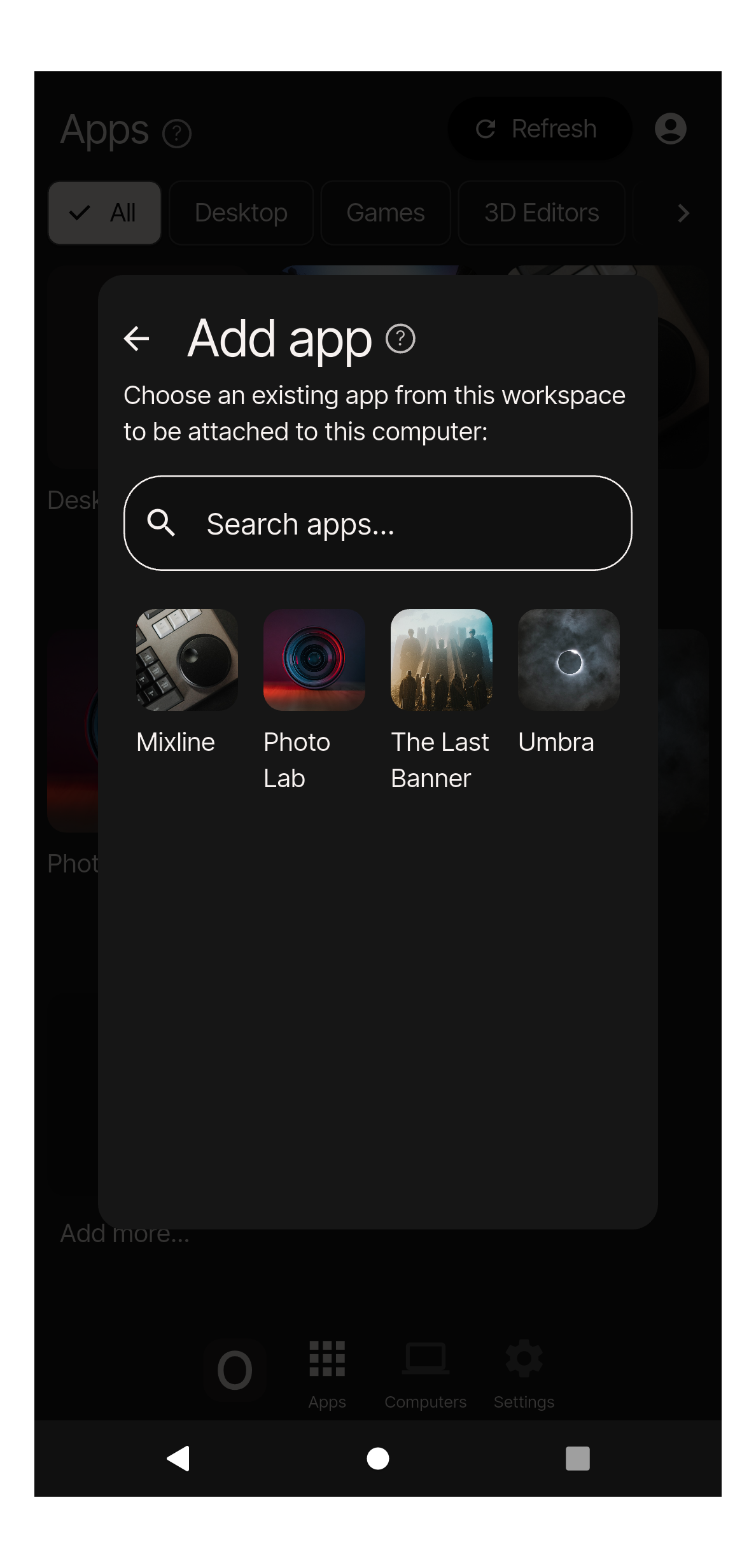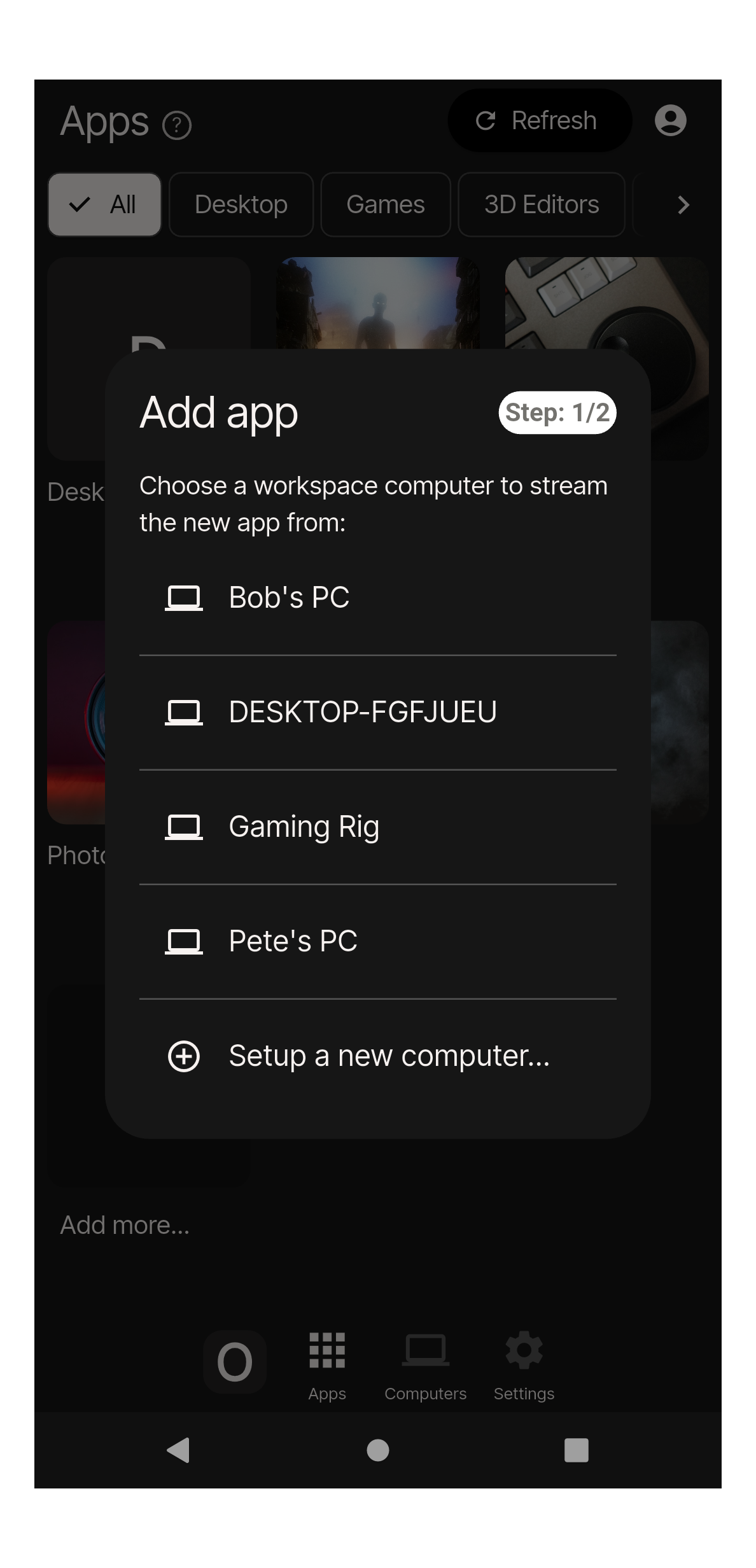 If you’re adding an app from a phone or another remote device (client), adding a new app will show the message: ‘Choose a workspace computer to stream the new app from.’