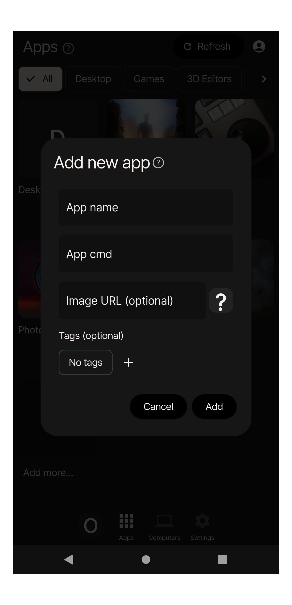 After selecting ‘Add app manually’, you will be able to enter the app path/ the app cmd from the computer you want to stream the app from.