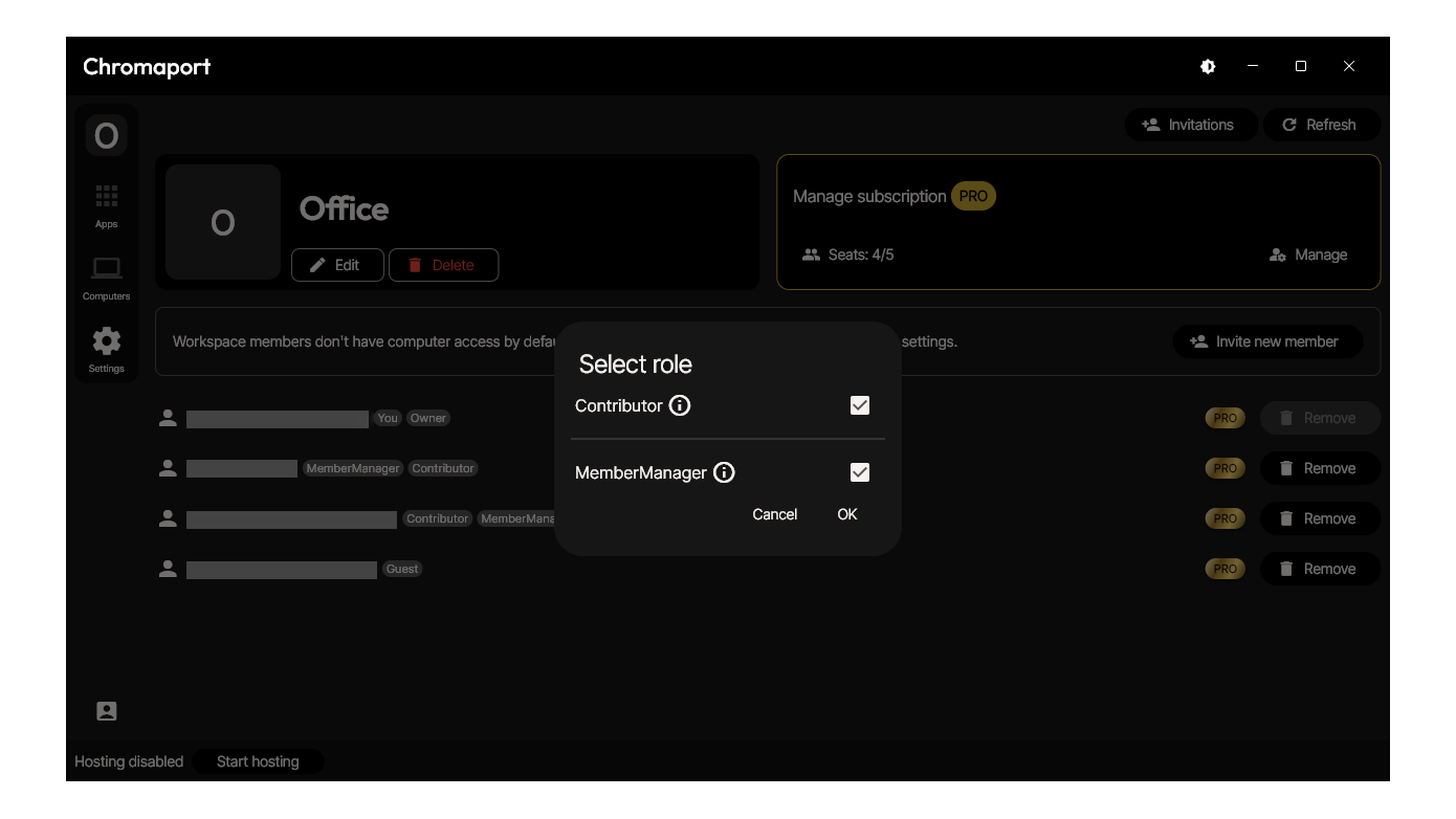 Workspace roles define what a user can do across the entire workspace. Unlike computer permissions (which apply to specific machines), roles determine overall capabilities such as managing members, adding computers, or working with applications.