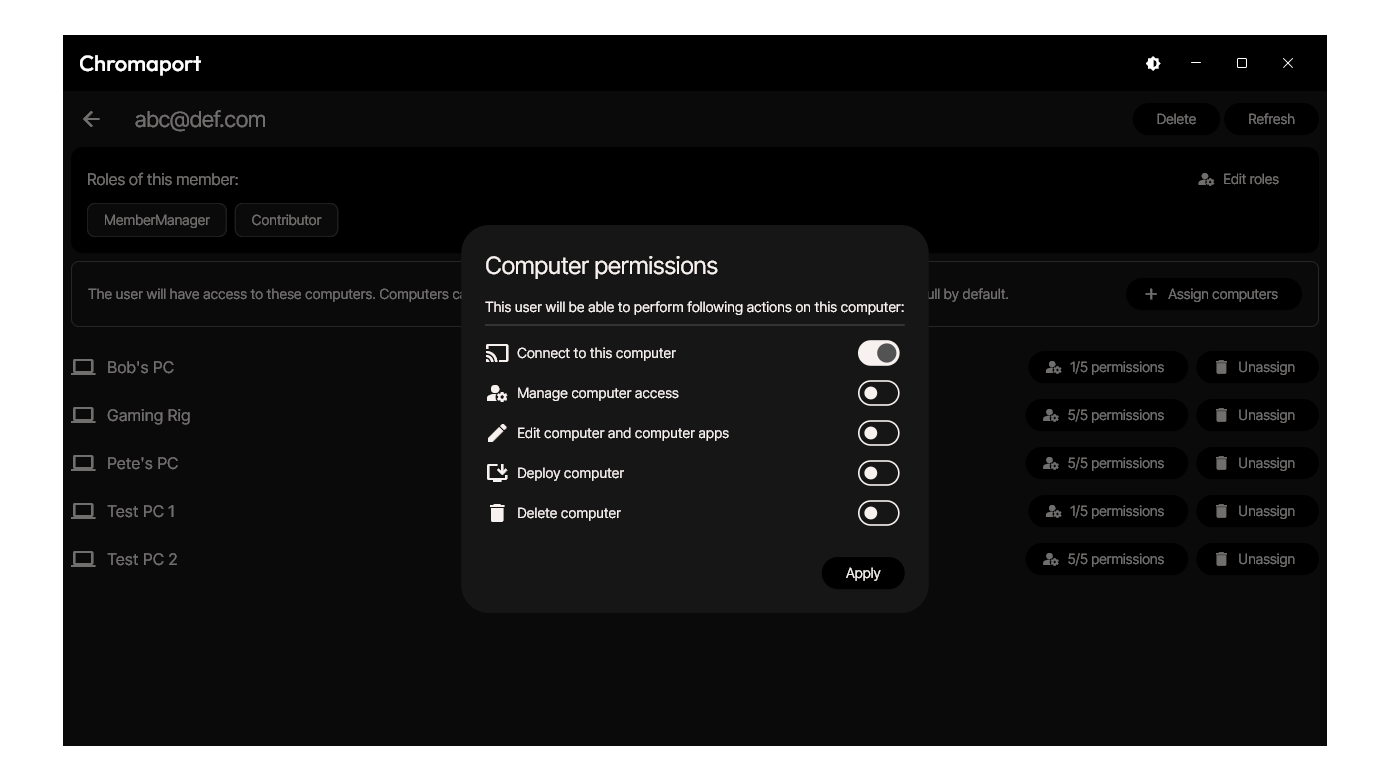 Computer permissions allow you to define exactly what actions each member can perform on a specific computer. This gives you precise control over access and ensures that users only have the level of control they need.